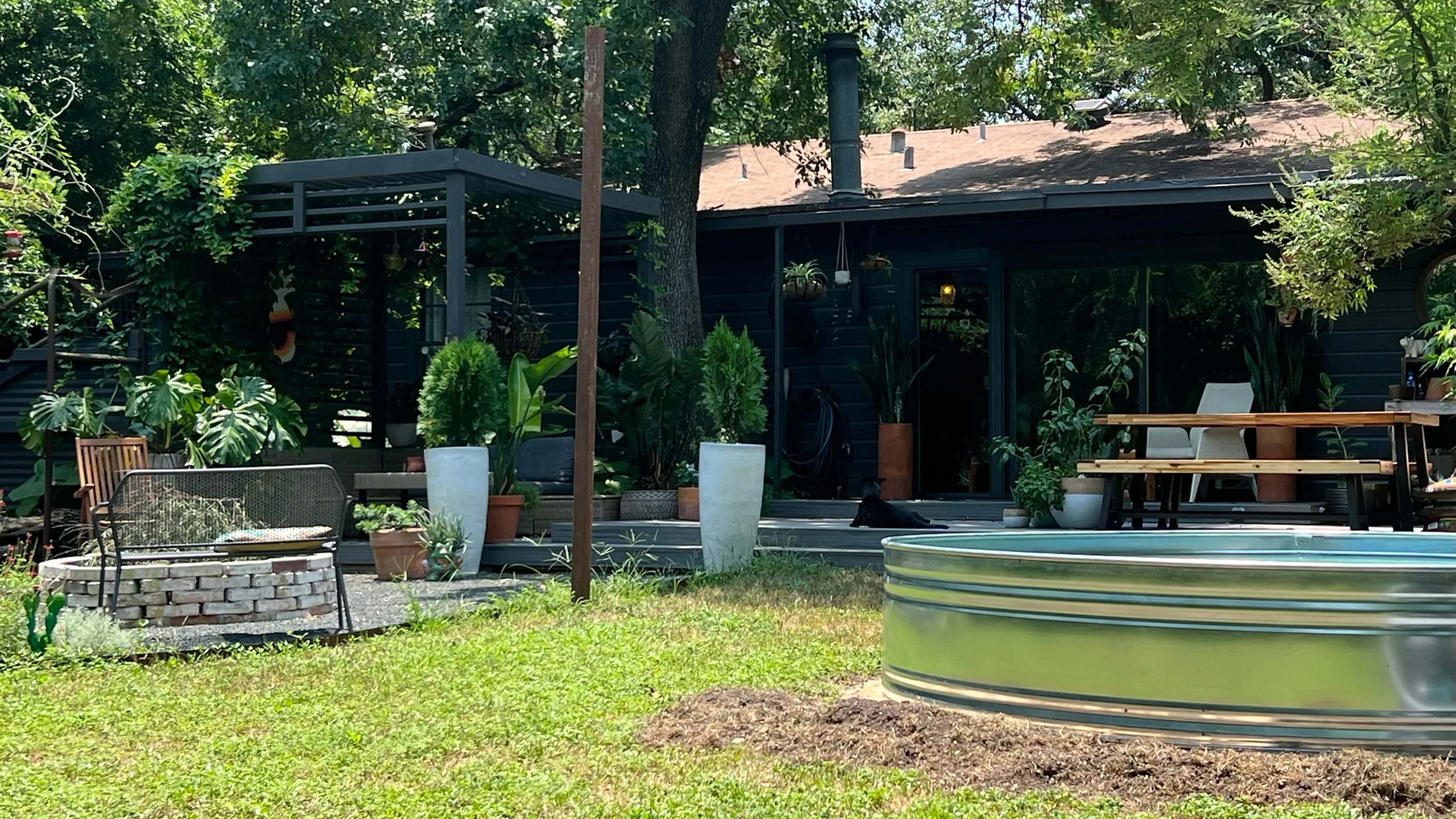 Later in 2022, we replicated the “vibe” by creating a pergola over part of our entry courtyard. The extra shade gives a cozy feel that almost adds an entry room to our house. We’ve also put in some cross vine that hopefully does as well on this structure as it did in the back yard.